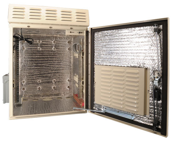 This 12RU is a perfect solution for any small backhaul application. The enclosure provides a full 12RU of mounting space in a compact, weatherproof enclosure. The unit is wall or unistrut mountable and features a pad lockable 3-point locking system. Dual 100 CFM fans are thermostatically controlled and flush hot air out through a 100% differentiated chamber above the cabinet. 120V Service entrance and duplex provide power to your rack needs and fans.
