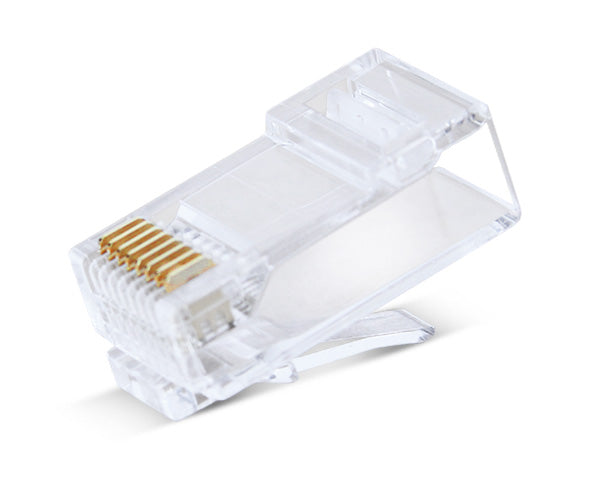 The Slim RJ45 Connector fits both solid and stranded CAT6 and CAT6A Ethernet wire with a 28-30 gauge. It is an 8x8 3-prong modular plug with a polycarbonate housing and 50u gold plated contacts for superior conductivity.
