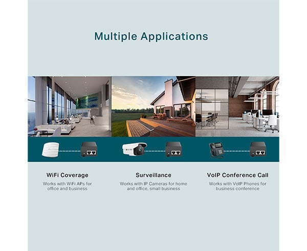 The PoE+ Injector TL-POE260S fully complies with IEEE 802.3af/at standards, and can work with all IEEE 802.3af/at PoE compliant PDs (Powered Devices) or PoE Receiver Adapters, such as TP-Link's TL-POE10R, or other equivalent product, to expand your network to where there are no power line or outlet, where you wish to fix device such as AP, IP Camera or IP Phone, etc.
