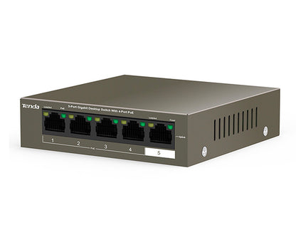 TEG1105P-4-63W is a Tenda PoE switch that offers 5*10/100/1000 Mbps Base-TX RJ45 ports. Ports 1-4 comply with the IEEE 802.3af standard (maximum PoE power output: 15.4 W) and 802.3 at standard (maximum PoE power output: 30 W). The switch offers a maximum PoE power output of 58 W and can supply power to APs, IP cameras, and IP phones and exchange data with them through CAT5 cables. It also provides simple management modes such as VLAN to help reduce cabling costs of IP terminals like APs and IP cameras.