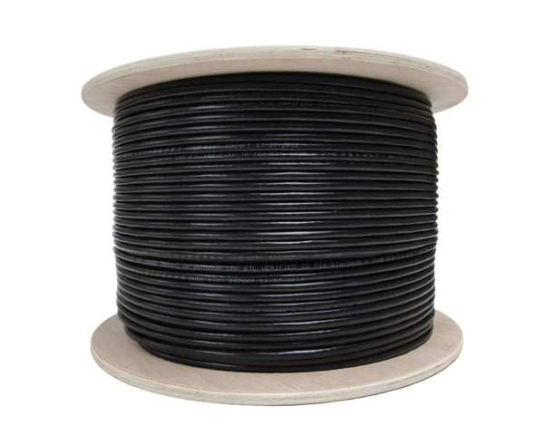 Item Number: C5CMXSM-3203- CAT5E Shielded Outdoor Aerial Ethernet Cable With Steel Messenger Cable in a Black Jacket, 1000ft on a Wooden Spool