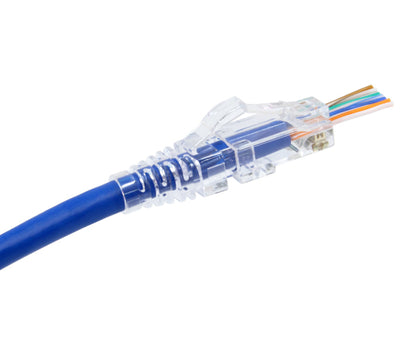 These Strain Relief Boots are designed to be used with our Easy Feed RJ45. Strain Relief Boots help to protect custom made patch cords from falling out of their ports or being disconnected from their RJ45 connectors. Boots help relieve the pressure and weight of the hanging cable. They also add protection to the connection point when being pulled on or reconnected multiple times. Our Boots greatly extend the life of CAT5e and CAT6 connectors. This slip-on boot has a snag-less design to help prevent snagging connectors when pulling through racks, walls, and cable bundles.