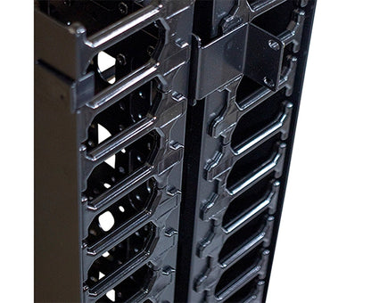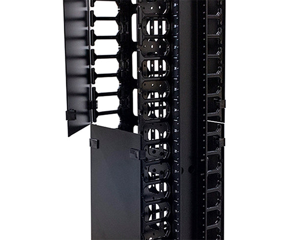 Our Double Vertical Finger Duct Cable Managers provide the extra capacity required for high-density rack installations. Constructed of (2) 3” wide managers mounted back to back, these double managers offer the same features as the single managers – molded plastic fingers with smooth, rounded edges that won’t snag or bind cables, removable split hinged covers, and pass-through openings along the back wall.