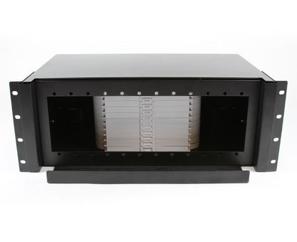 This rack mount fiber optic patch panel is a 4 Rack Unit (4U/4RU) high density distribution unit that provides high density fiber capacity of up to 288 fibers when utilizing 12 of our LGX type LC quad adapter panels. Included with this Fiber Patch Panel are twelve 24 fiber splice trays. This panel also includes a smooth sliding drawer type pull out system.