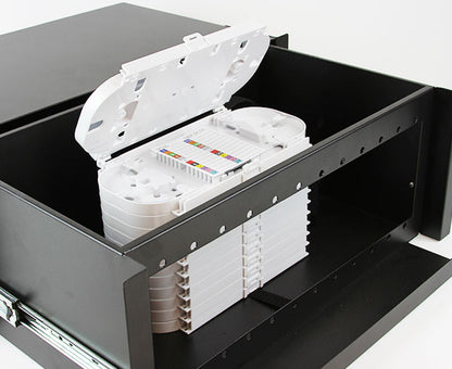 Rack Mount Fiber Distribution Patch Panel with Splice Trays, Slide-Out, 4RU, Up to 288 Splices