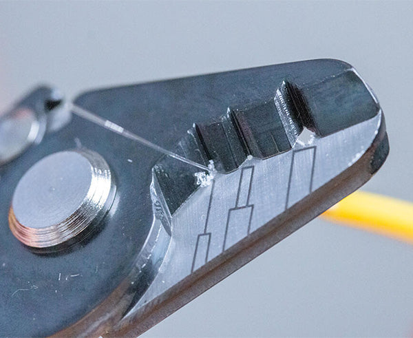 - Fiber Stripper strips the 1.6-3 mm fiber jacket, 600-900 micron buffer coating, and 250 micron cable down to expose the 125 micron glass fiber