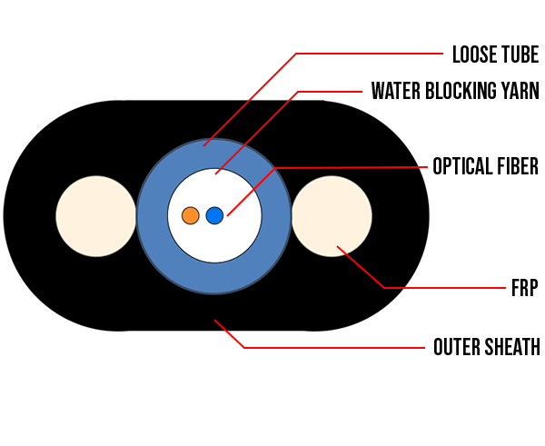 The Dielectric Dry Flat Drop Cable comprises bare-colored optical fibers (available fiber counts are 2, 6, and 12) with water-blocking aramid yarn inside a 3.0mm dry buffer tube. The UV-resistant polyethylene outer jacket encases the buffer tube along with 2 dielectric FRP strength members, one on each side of the buffer tube. All component materials meet the EU RoHS Directive standard.