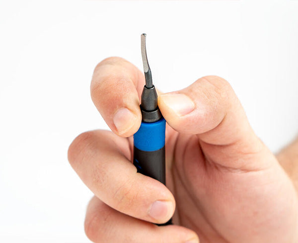 - S-shaped blade cleanly deburrs the edges and insides of microduct tubes