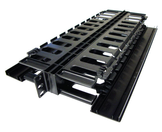 The Double-Sided Finger Duct Cable Management panel, available in 1U and 2U, features 24 extra-large slotted cable ducts on each side designed to provide horizontal cable management on the front and rear of the rack. Sturdy plastic construction ensures years of quality use in standard 19" Racks and Enclosures.