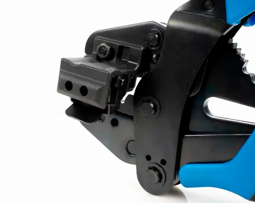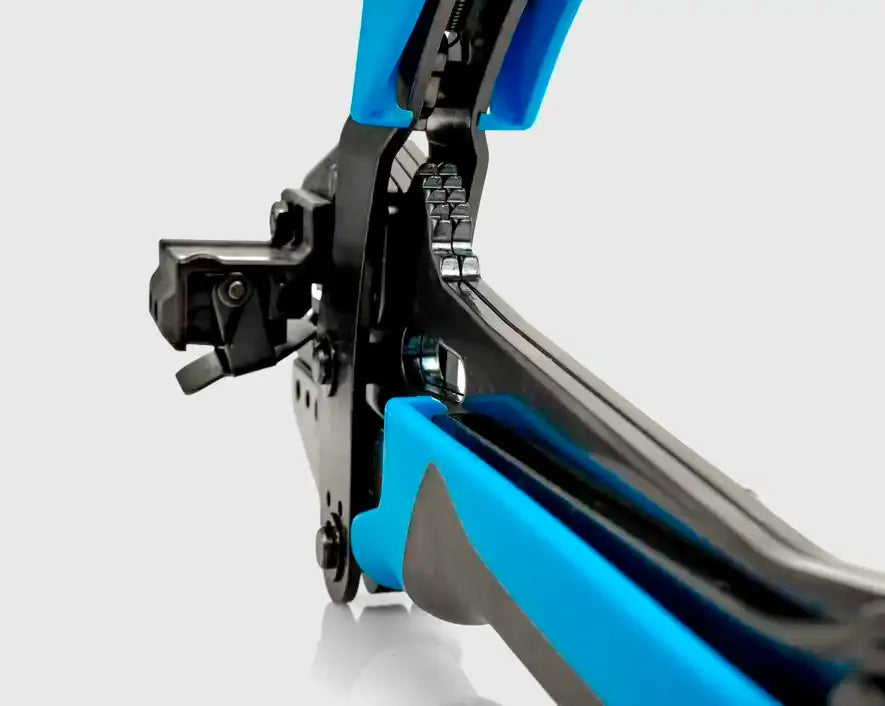 - Parallel jaws with adjustable pressure-regulating gear and self-locking design crimp solar panel connectors perfectly every time