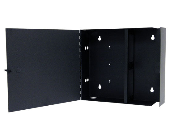 Wall Mount Fiber Patch Panel, Single Outer Door, Holds 4 Splice Trays and 4 Adapter Panels, Up to 48 Ports, Matte Black